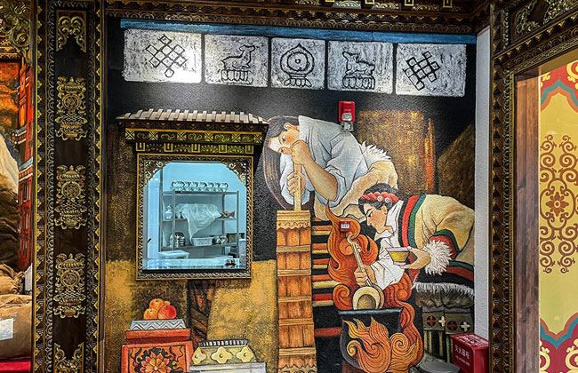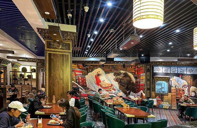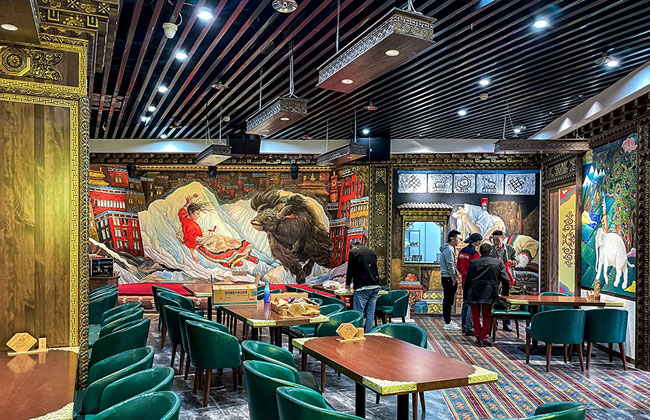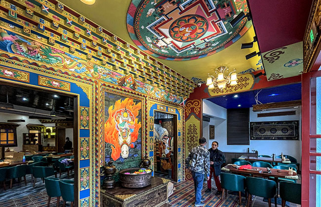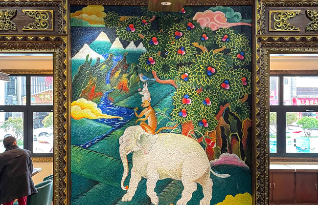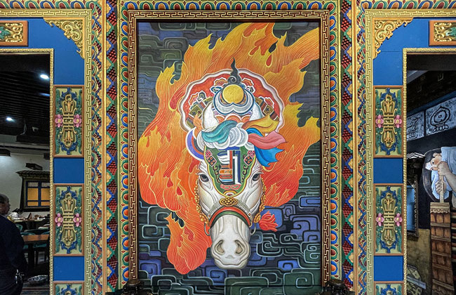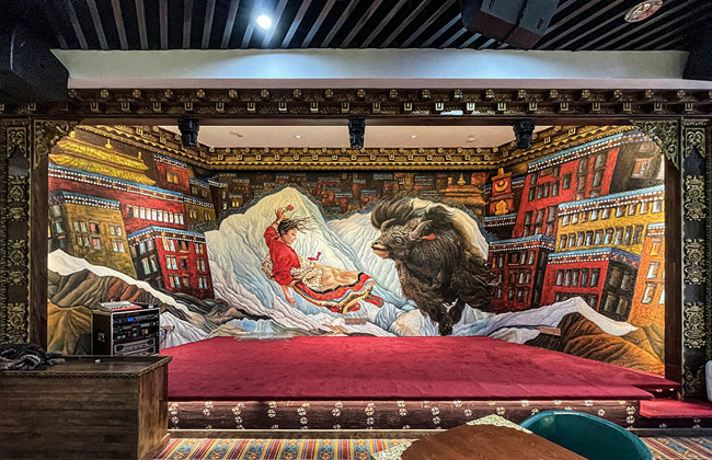 这是我们绘画的敏珠拉姆第四家分店。第一家还是2012年画的。这家店位于云南省丽江市。敏珠拉姆,一家用心打造的餐厅,它不是传统意义上的藏餐厅,而是藏族文化结合了很多当代的元素,既发扬了藏族文化,又不失现代特色。